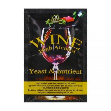 Packing 28 grams of high alcohol yeast, nutrients and vitamins, the new Bulldog High Alcohol WineYeast is the perfect choice for country wines. Ferment up to 17% ABV wine from fruits and juices (and sugar if required) in 5 to 7 days at 20 oC to 30 oC.