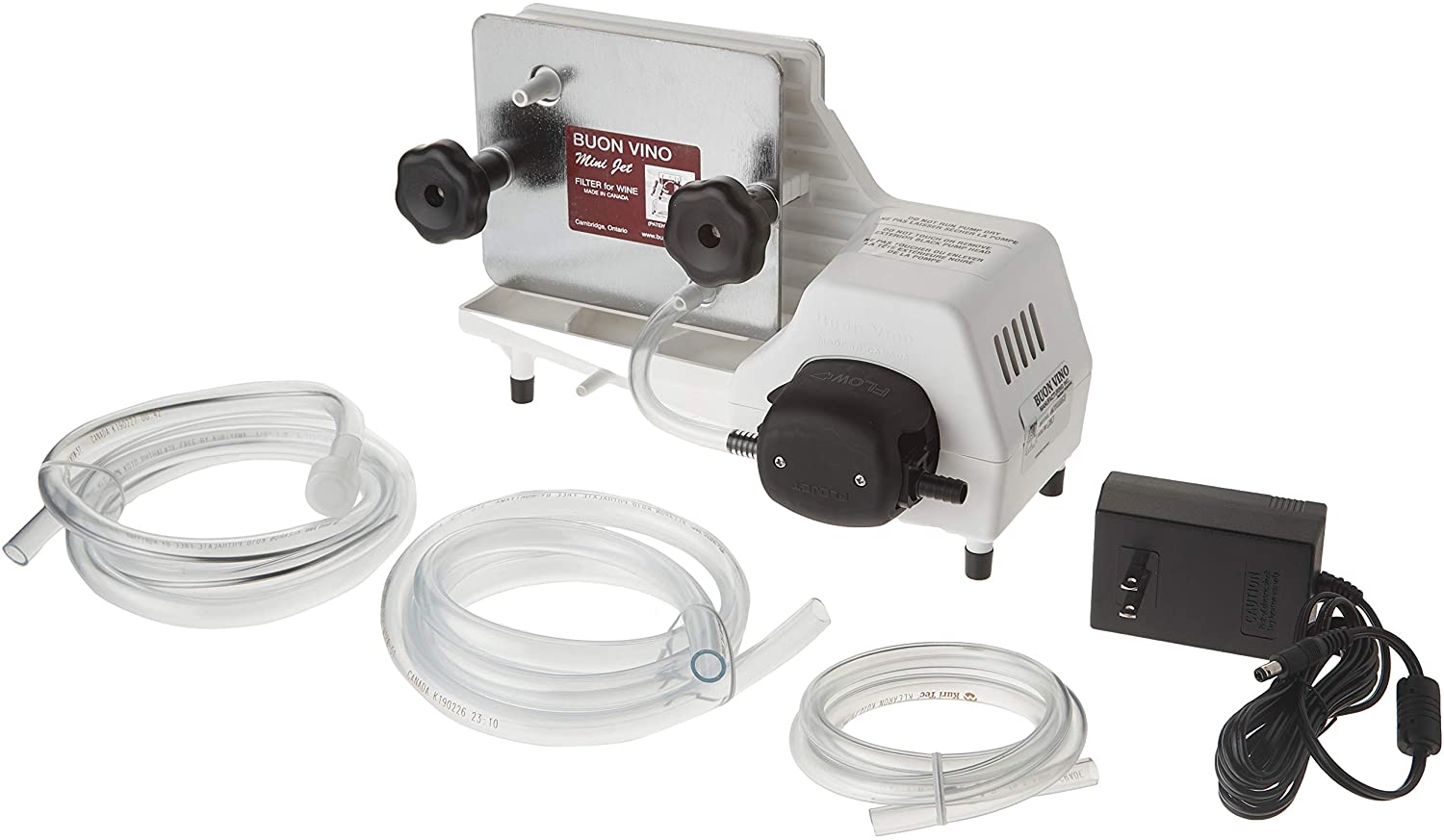The Buon Vino MiniJet has been designed with the small quantity winemaker in mind. It is the perfect way for the home hobbyist to produce a wine with a commercial shine. Perfect for the home winemaker who filters 23L (6 Gallons) at a time from kits or basically fresh fruit wines. Its compact design incorporates a self-prime motorized pump capable of filtering up to 23 liters in 15 - 20 minutes. A built in drip tray and drainage tube ensure a no mess, no fuss clean-up job. And its triple filter pads add a crystal clear, sparkling quality to your wine. Technical Specifications; Self-prime pump with incorporated motor (cool down required every 20 - 30 minutes of filtering), Filtering surface 465 square cm, 23 litre jug (approximate) per 15 - 20 minutes, 3 grades of pads (purchased separately), Coarse, Polish and Sterilizing. Dimensions; 30 cm (length) x 14 cm (width) x 18 cm (height). Weight; 3 kilograms C.S.A. approved. For best recommended cost effectiveness the Buon Vino MiniJet filter should be used no more then once or twice a week (on average) for filtering 23 liters (6 gallons) of wine in one “session”. If more filtering is anticipated please consider the Buon Vino SuperJet filter.